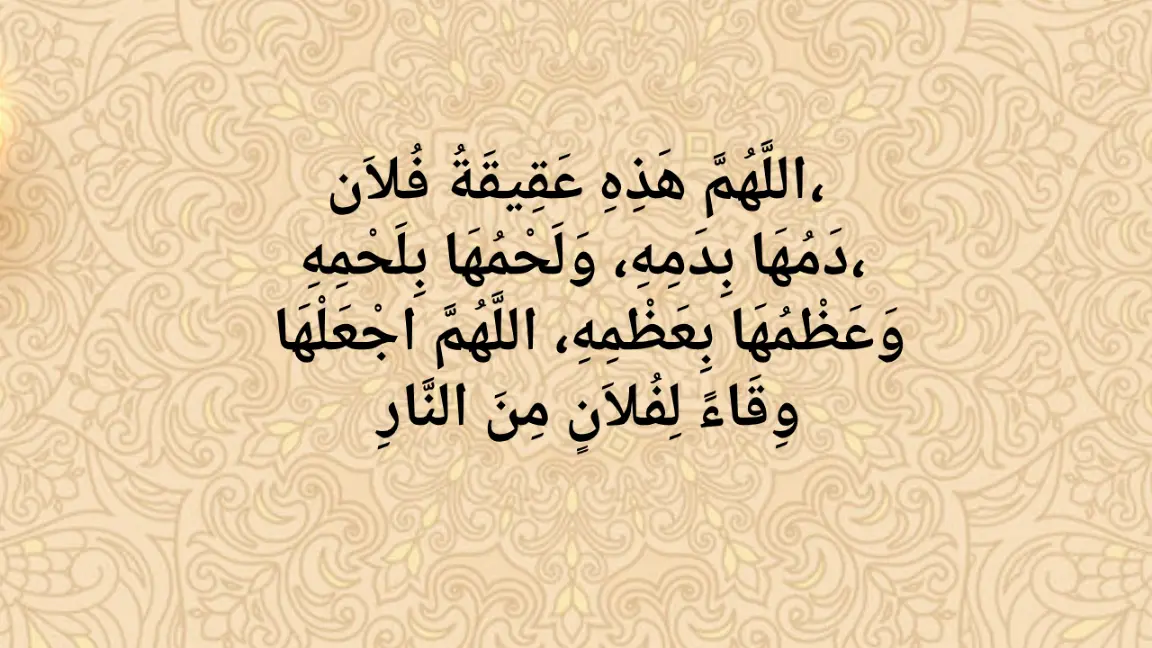 “Allahumma haadhihi ‘aqeeqatu fulaan, damuha bidamihi, wa lahmuha bilahmihi, wa ‘azmuha bi’azmihi. Allahumma-j’alha wiqaa’an li-fulaan min an-naar.”