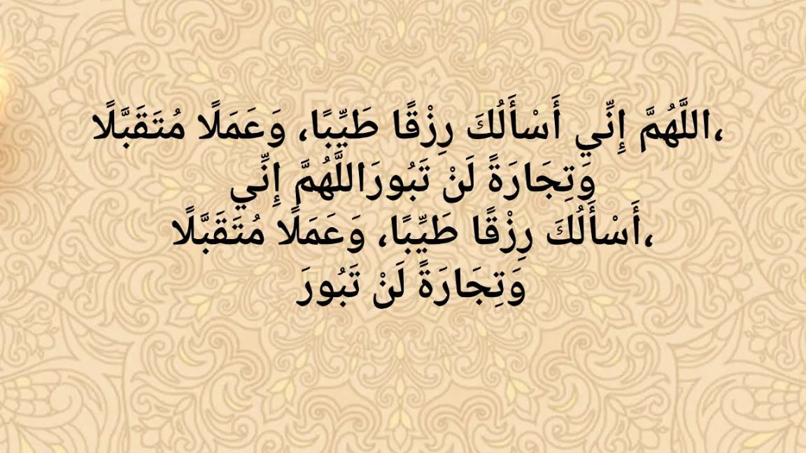 اللَّهُمَّ إِنِّي أَسْأَلُكَ رِزْقًا طَيِّبًا، وَعَمَلًا مُتَقَبَّلًا، وَتِجَارَةً لَنْ تَبُورَ